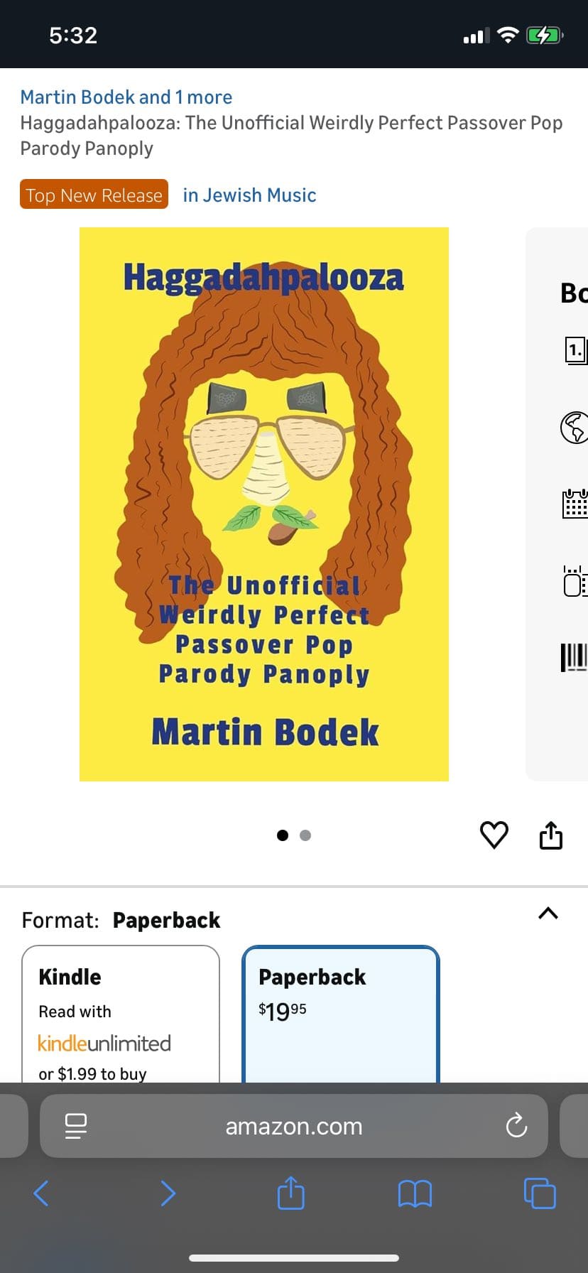 His latest, Haggadahpalooza: The Unofficial Weirdly Perfect Passover Pop Parody Panoply is his fourteenth book. He’ll eat it up, he loves it so.