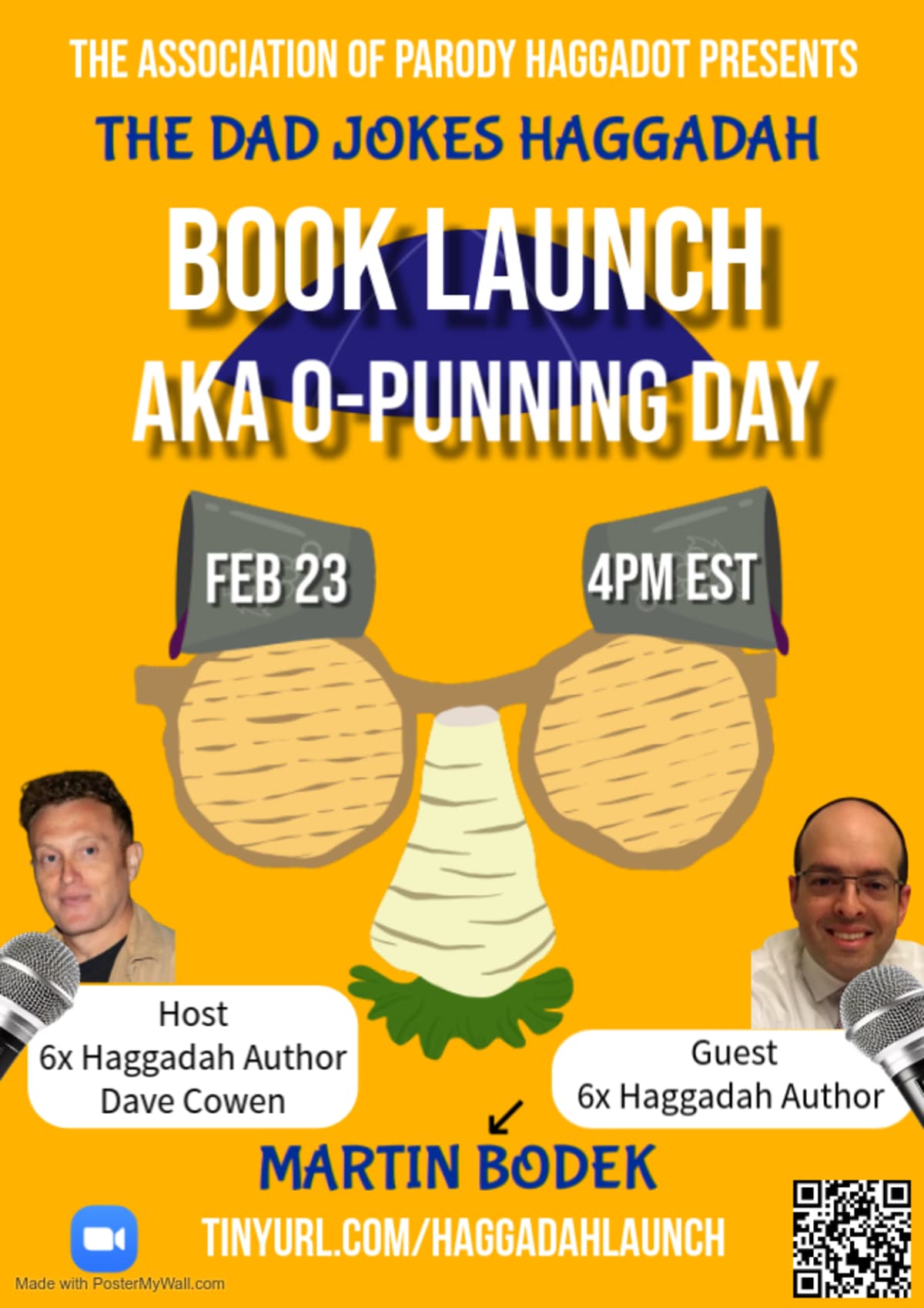 On Sunday, Feb 23, at 4:00 PM sharp, 6x Parody Haggadah Author Dave Cowen will be interviewing 6x Parody Haggadah Author Martin Bodek concerning the launch of his new book, The Dad Jokes Haggadah.