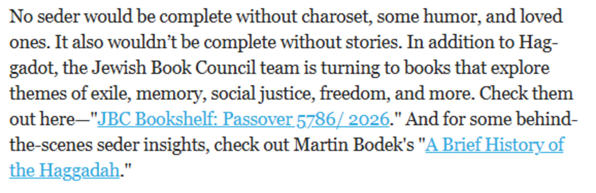 It as an absolute joy and a heaping measure of pride that Jewish Book Council reposts this article of mine annually, re-sends it in their newsletter, and updates the byline to include my recent work. It forms the basis of my Haggadah book talks, and I'm thankful to them for reaching out to me in the first place to commission the research.